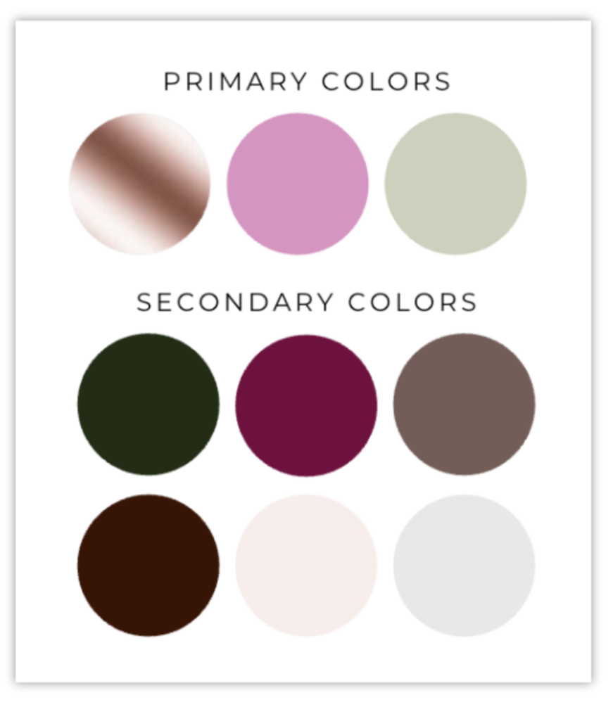 Rose gold, blush pink, sage, and cream with deep wine accents.